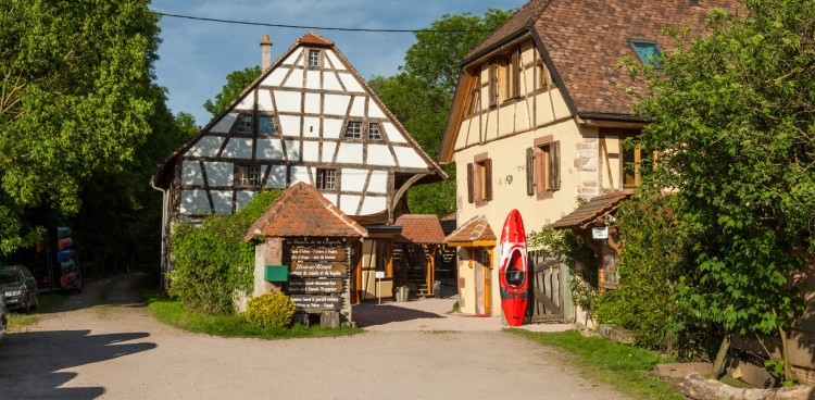 Lieu de RV : à 30 mn de l’hôtel, chez Alsace Canoës, au magnifique Moulin de la Chapelle, route de Marckolsheim, à 4 km de la charmante cité touristique de Sélestat, au pied du Haut Koenigsbourg.